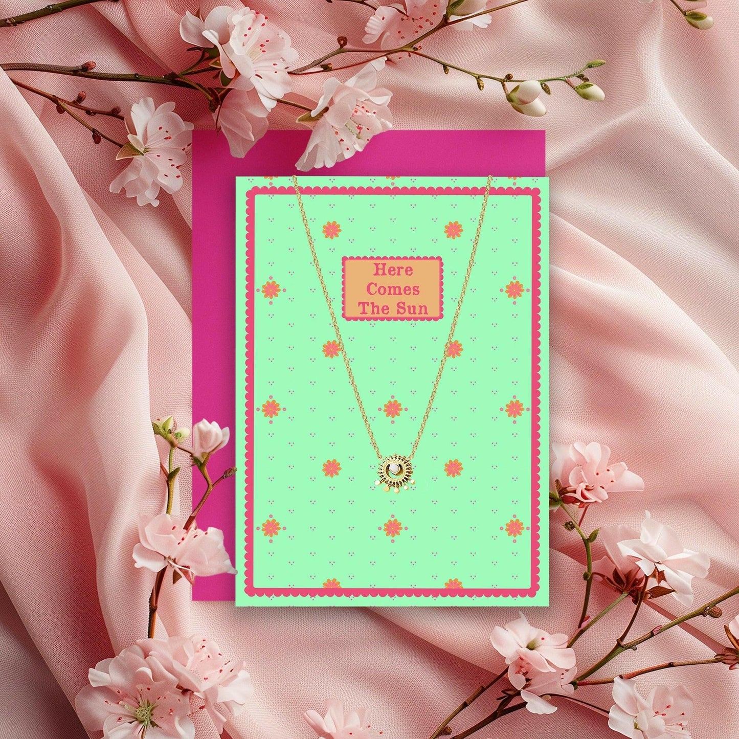5. Gold and Stone Sun Pendant Necklace and Here Comes the Sun Card Gift Set - Crumble and Core