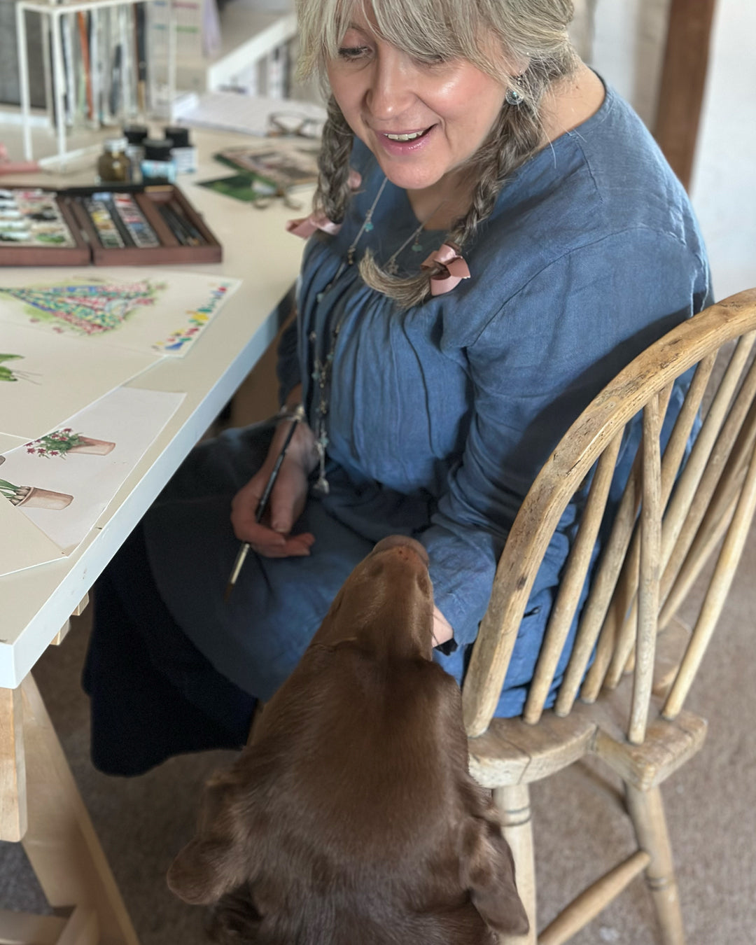 Co-Founder and Artist, Jilly obviously brought her incredible Portfolio of paintings. She was taught to paint by her dad at the age of 10 and that ignited a long-life passion for watercolours.She went on to train at Art College in textiles and illustration and was a Published Freelance Artist for many years. Jilly’s favourite card is our Art Studio Card from our Classic Crumble Collection.