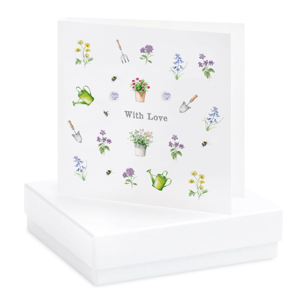 Introducing our beautifully crafted Sterling Silver Stud Earring Card, perfect for garden enthusiasts. This unique card measures 85 x 85mm and is made from FSC certified 350 gsm paper, milled right here in the UK. Each card is hand-finished with stunning sterling silver jewellery and includes butterfly backs for a secure fit.