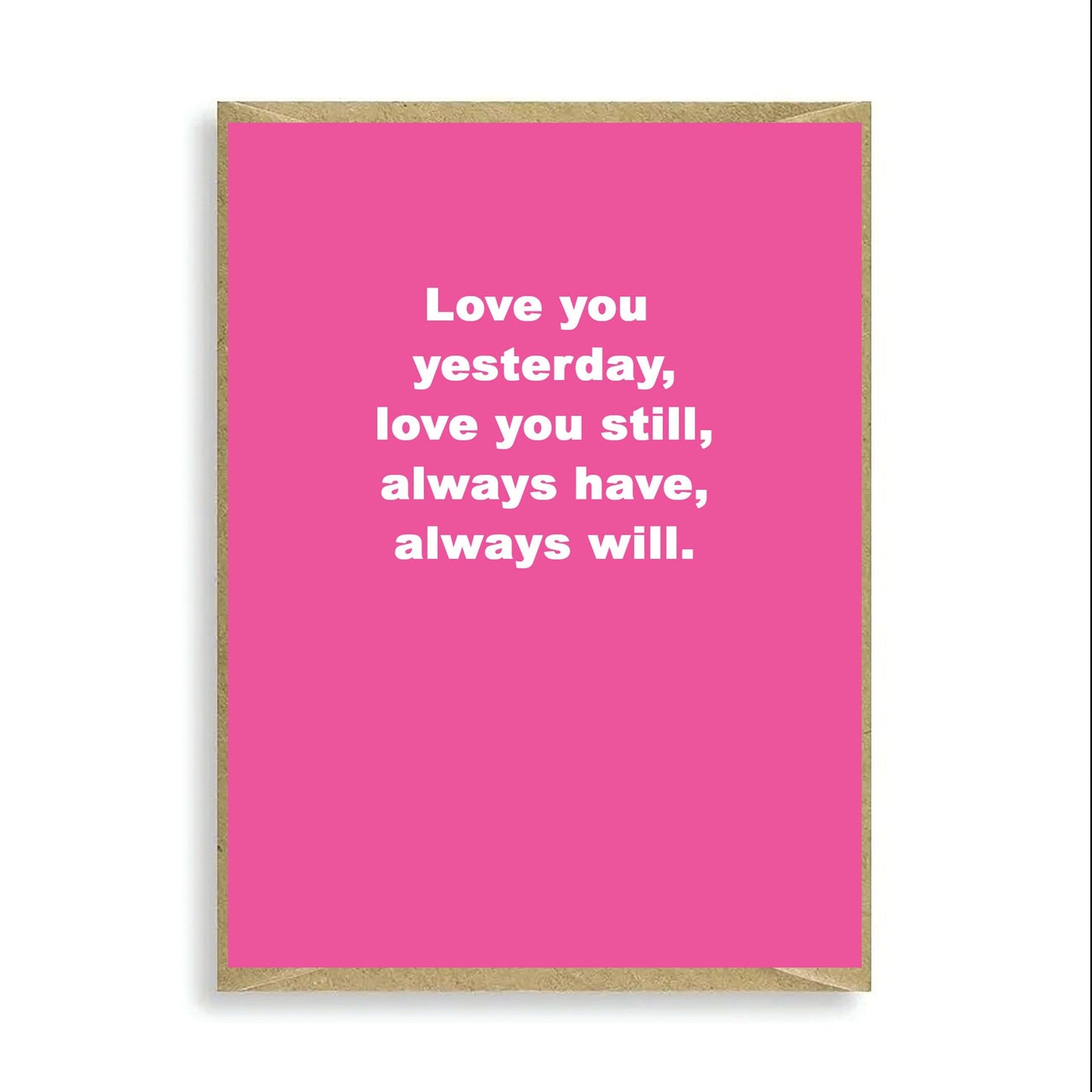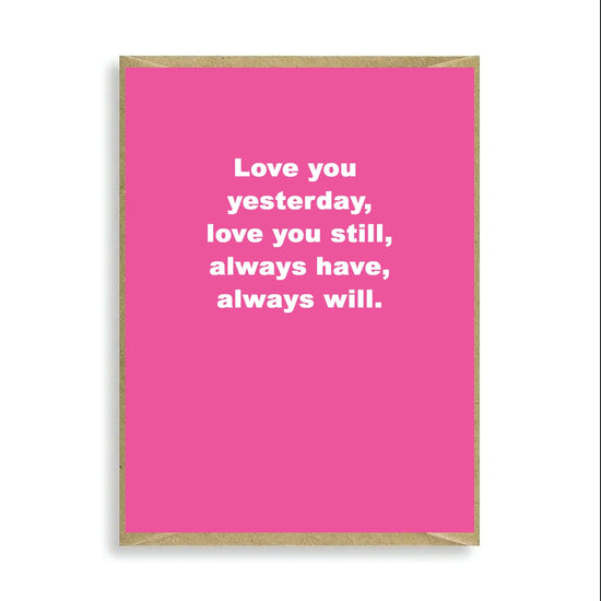 Keywords: Valentines Partner, Humour Card, Funny Love Card, Mini Card, Valentine, Love You Yesterday, Love Card, Printed, 350gsm Greeting Card, 120mm x 90mm, FSC Certified, UK, Blank Inside, Brown Kraft Envelope.